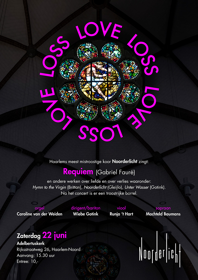 Requiem (Fauré) Première: 'All that is Made of Love' (Gotink) Solo (Pie Jesu): Machteld Baumans; orgel: Caroline van der Weiden;viool: Ruña 't Hart. |